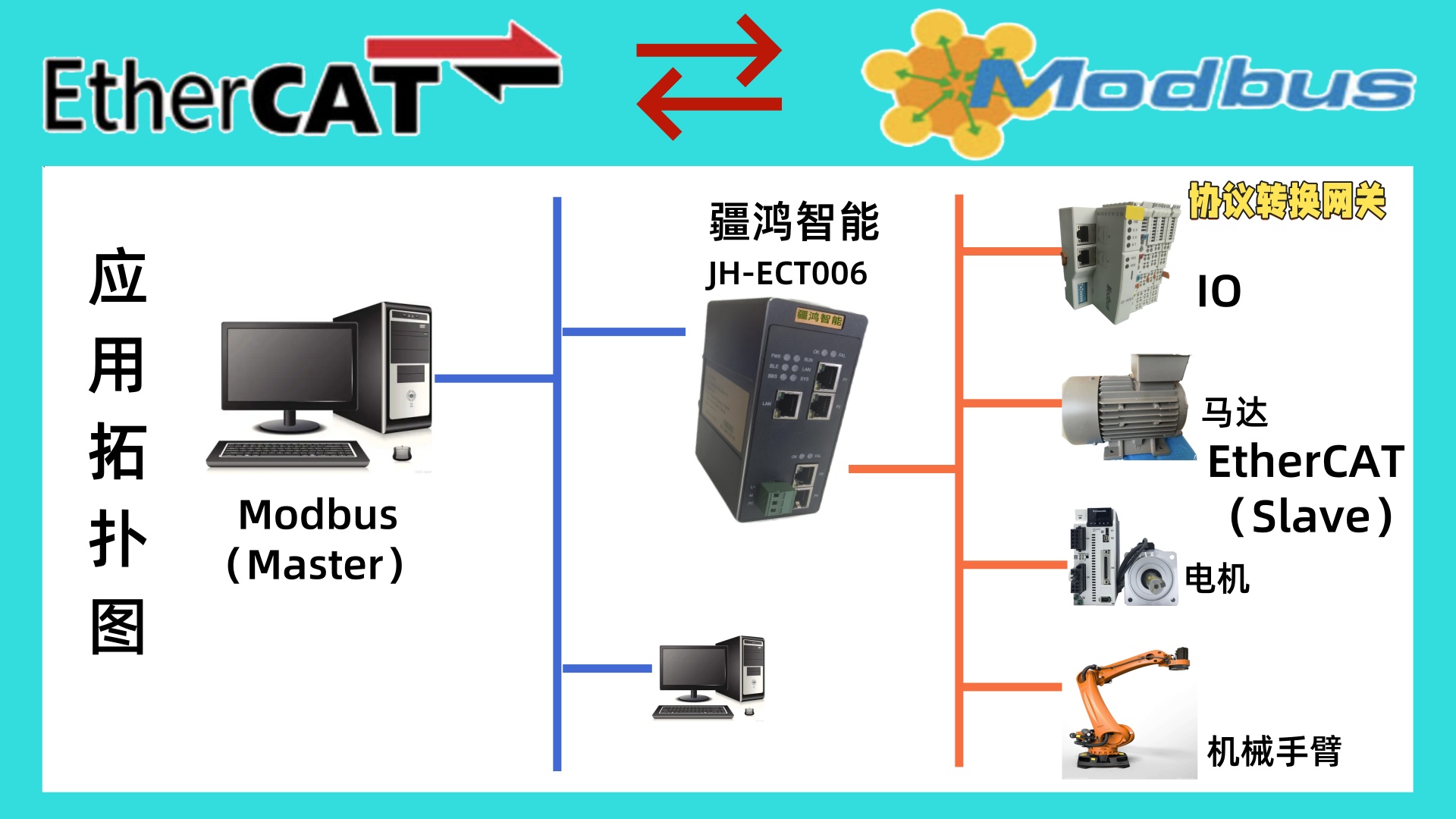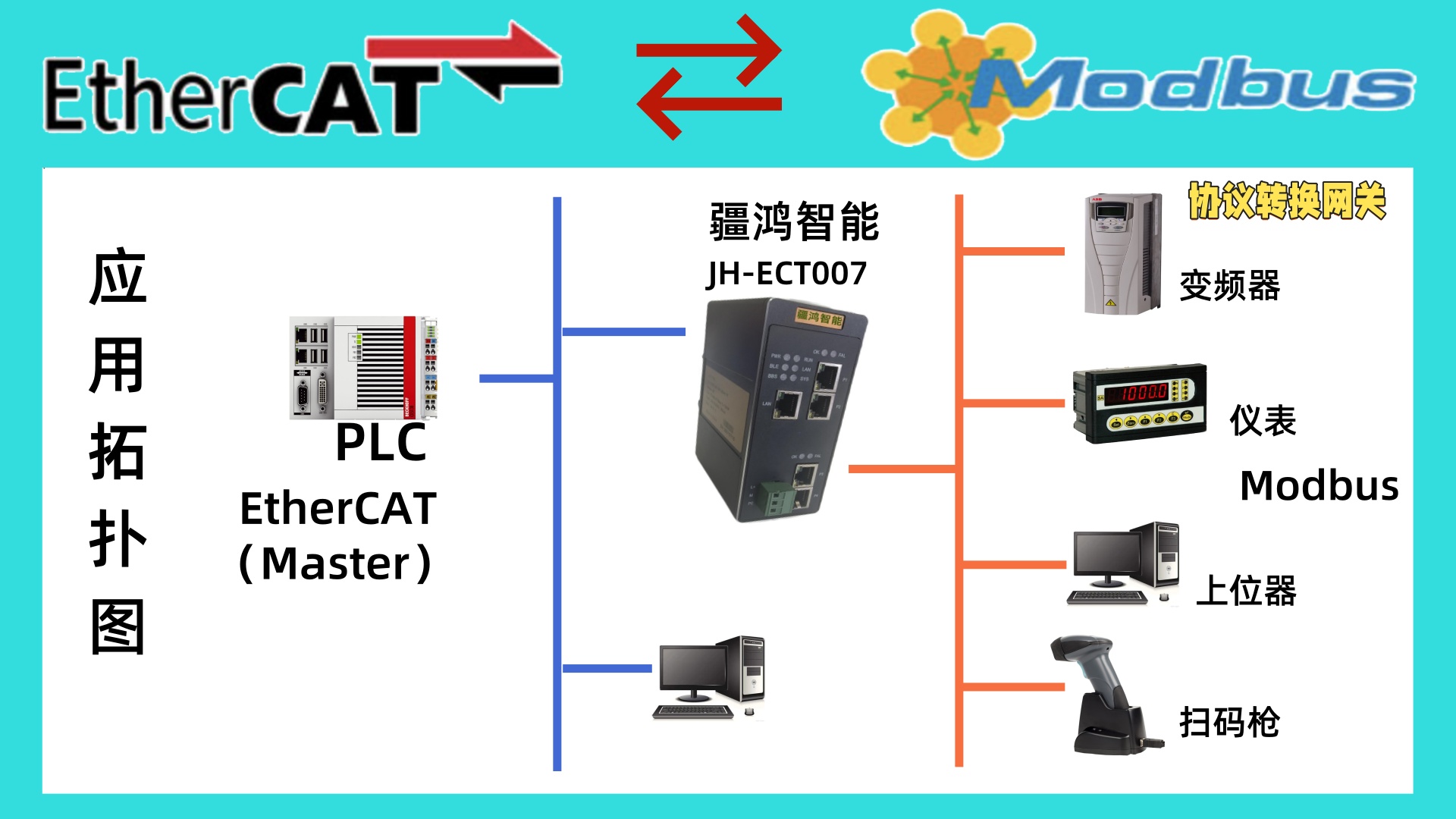 一,设备主要功能 疆鸿智能JH-ECT004实现EtherCAT网络与Modbus网络之间的数...