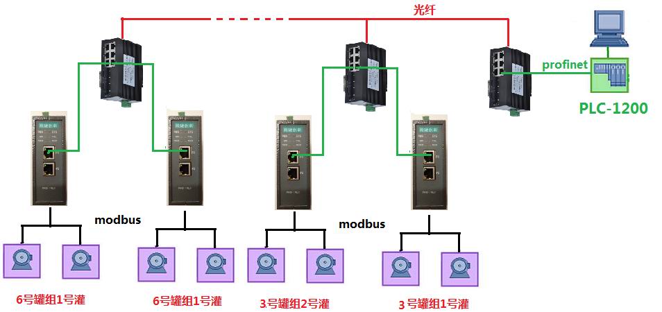 本案例现场在天津市燃料油公司,该公司拥有15万吨储油设施,本案应用于3~6号罐组。每个罐组有6~12个不等的油罐,每个油罐有两个电动阀门控制油罐的进油和出油。电动阀门采用的是modbus的通讯协议,PLC使用的是西门子1200系列PLC,现场采用PROFINET工业以太网通讯,通过modbus转profinet网关转换。由于油罐与控制室距离较远,所以现场采用开疆智能生产的WYS208/2F两光六电光纤以太网交换机。本案例的目的是在中控室控制油罐的进油、出油的开关以及电动阀门的位置等操作。