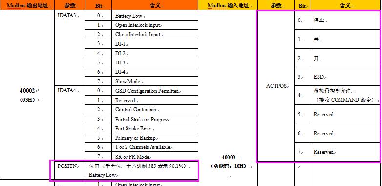 通讯规约如下表一:本案例需要读取电动阀门的位置(modbus 地址40002),写阀门的停止,关,开等命令(modbus 地址40000的bit0,bit1, bit2····)