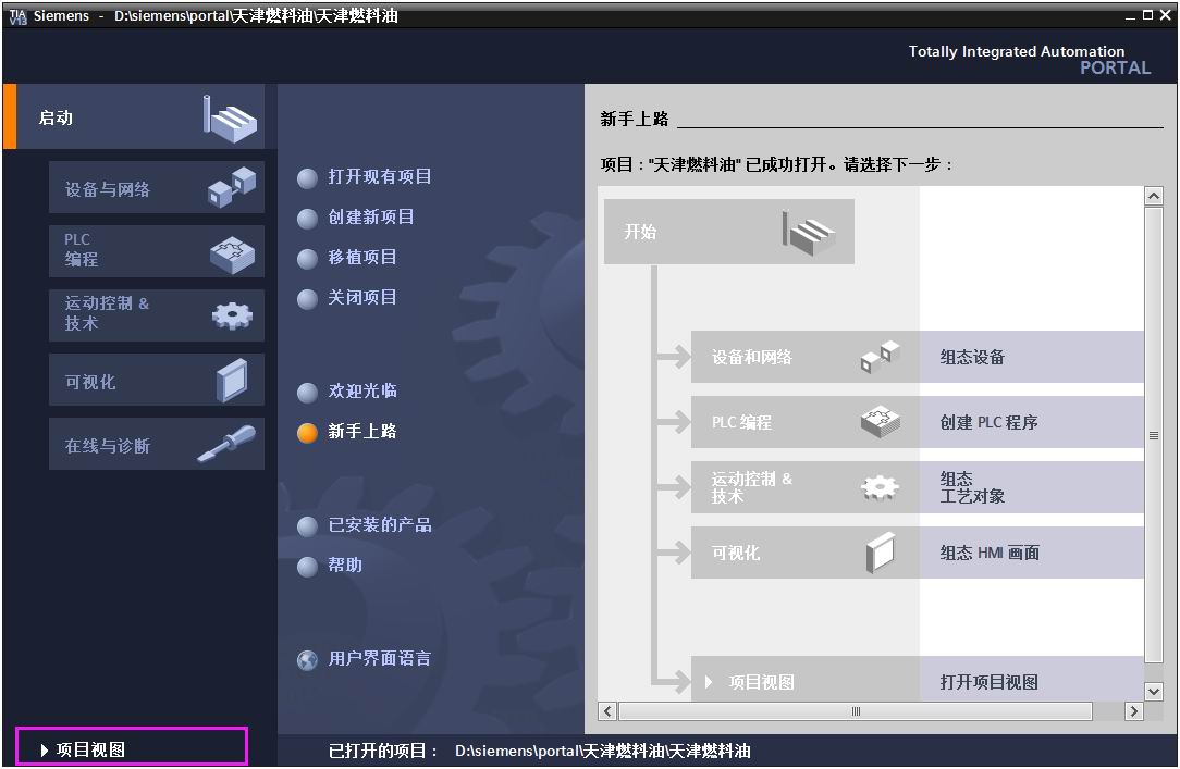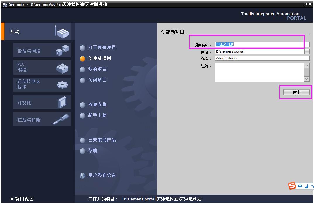 (1) 打开博途软件 “TIA Portal V13 ”创建新项目—>输入项目名称—>创建。图3-1:
